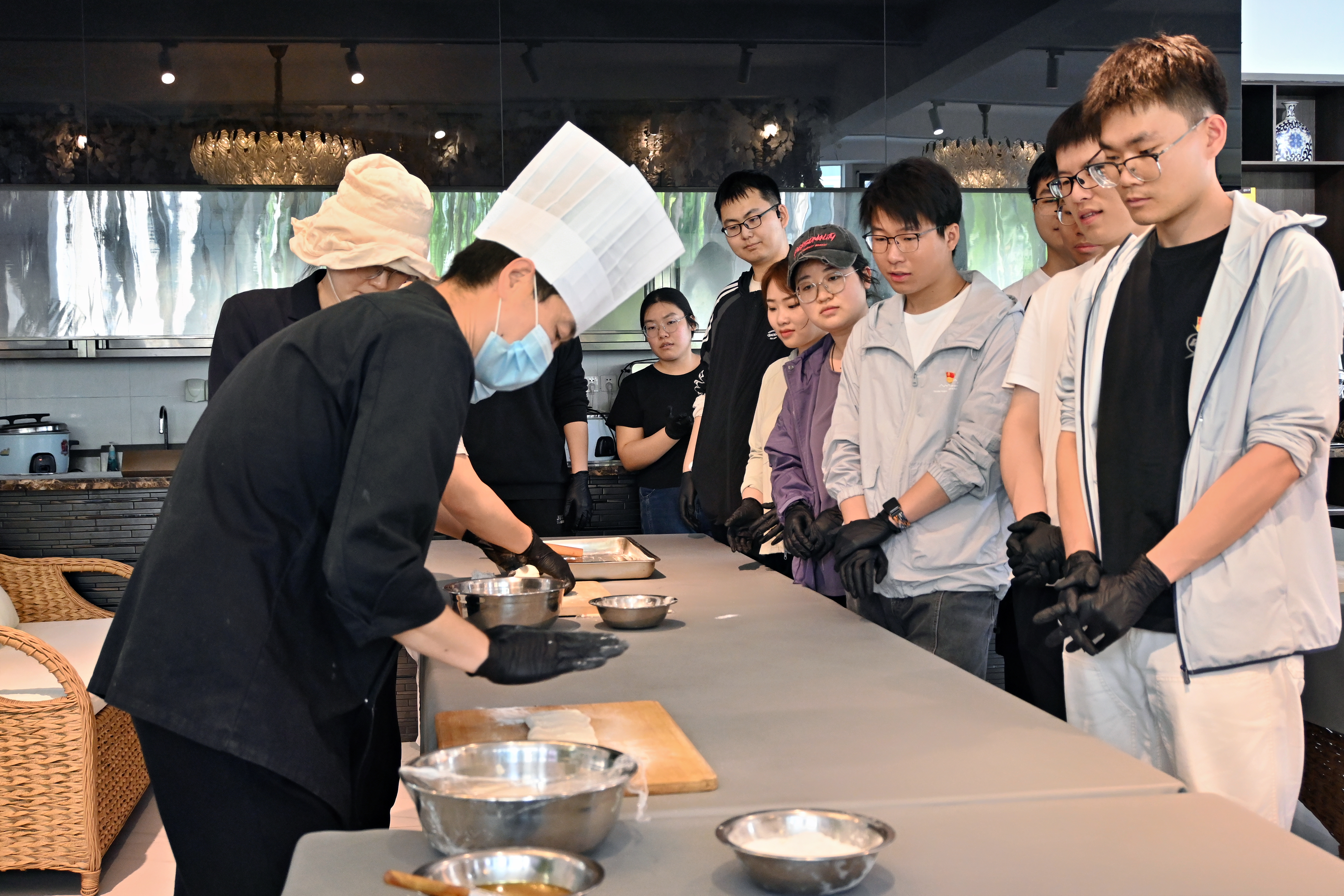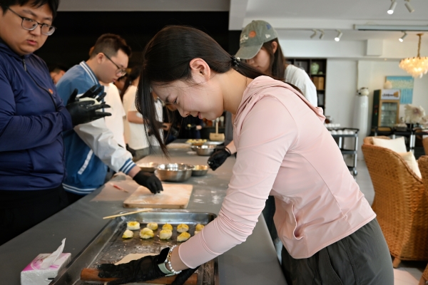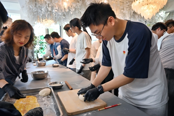 随后,师生们走进漫山慢水·小毛驴农场学习制作花卷。在师傅的指导下,大家纷纷挽起袖子,从揉面、擀皮到抹油、巧妙卷制,一步步学习制作这种朴素而美味的农家面点。平日里与代码、算法打交道的“程序员”们,此刻化身为“面点师”,在协作与分享中体验着劳动的快乐和创造的满足。