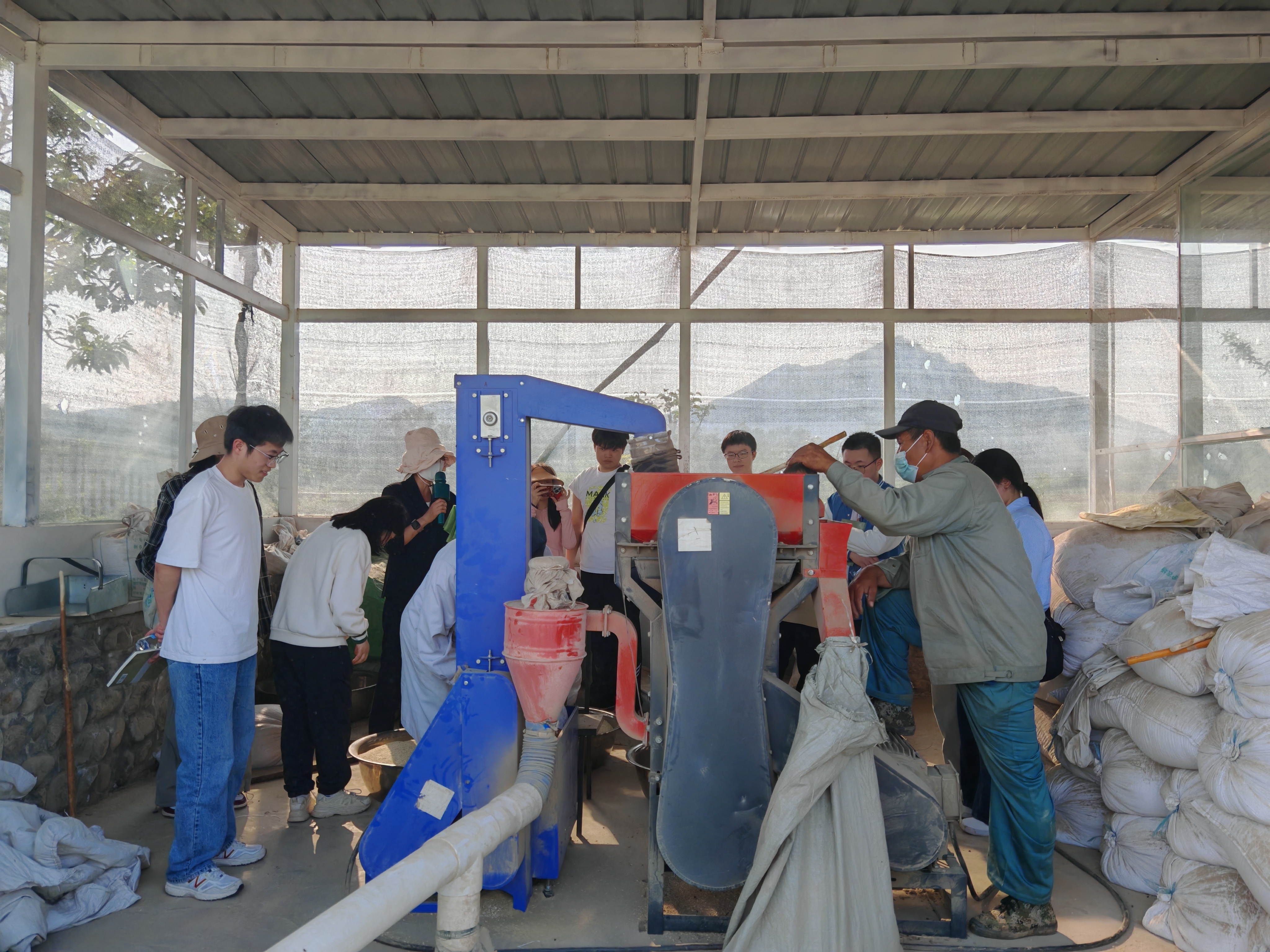 师生观察脱粒碾米机