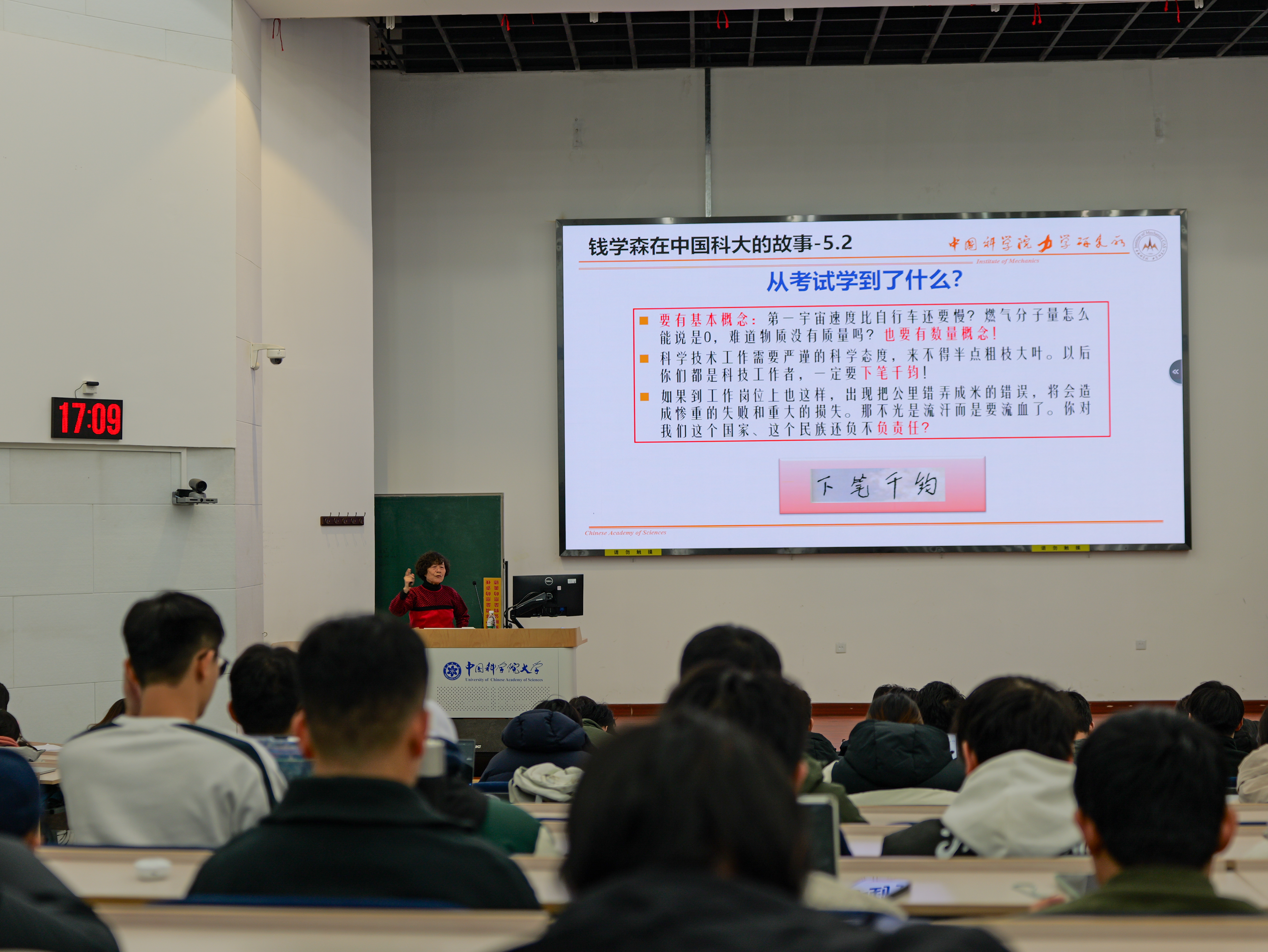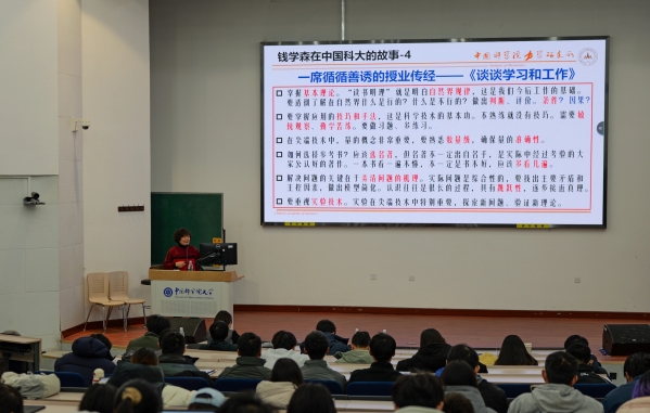 报告中,王柏懿深入解读了钱学森先生“严谨、严肃、严格、严密”的科研准则与育人初心。钱学森先生在中国科学技术大学任教期间,不仅为本科生量身编写教学讲义,反复打磨每一道考题的逻辑与深度,还逐份细致批改作业,不放过任何一处概念模糊或数据小数点偏差的细节。王柏懿引用钱学森先生的话提醒同学们,“科学技术工作需要严谨的科学态度,来不得半点粗枝大叶。以后你们都是科技工作者,一定要下笔千钧!”