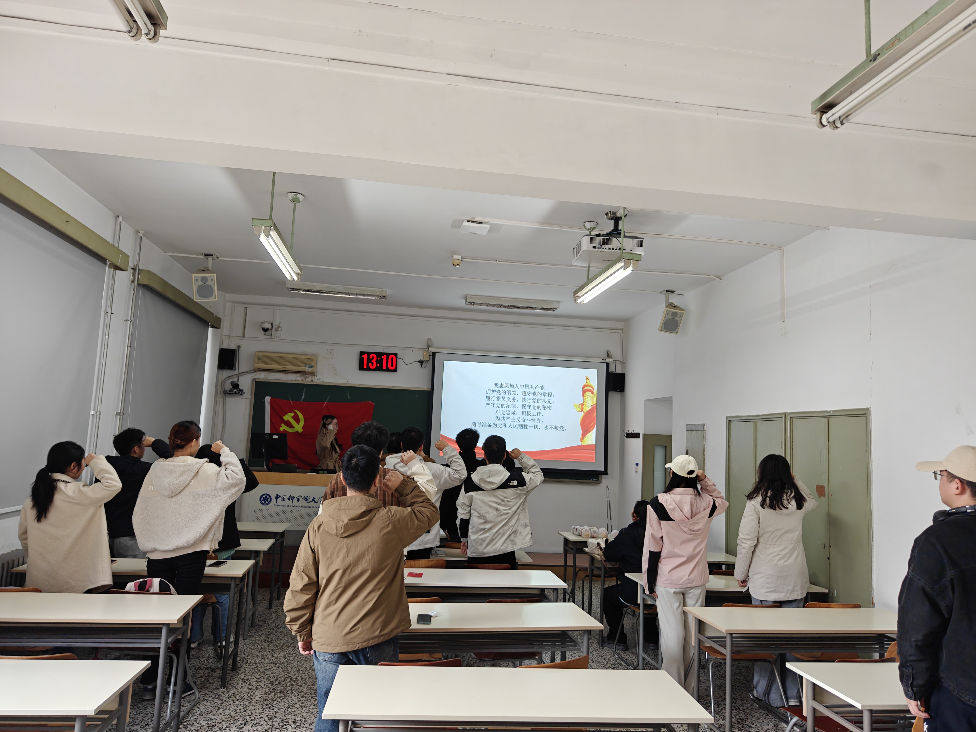 学习讨论结束后,王嘉怡带领全体党员,面向党旗,重温入党誓词。铿锵有力的誓言在教室内回荡,彰显了党员们对党的绝对忠诚和为共产主义事业不懈奋斗的坚定决心。