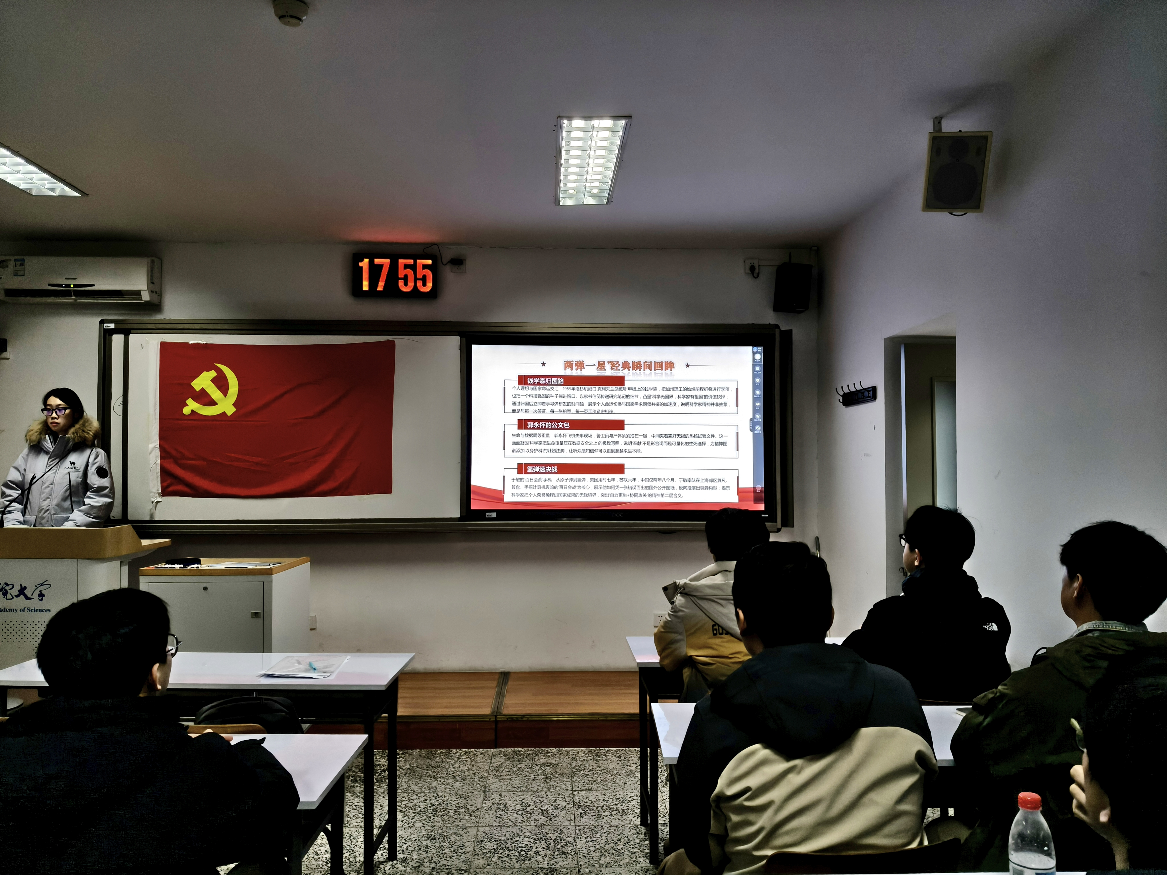 结合学习内容与日常实际,会议第三部分聚焦“我们该如何做”展开探讨。管昊琛向同学们发出倡议:一要坚定红心向党,矢志爱国奉献。 作为学生党员与进步青年,应自觉加强理论武装,筑牢信仰之基,将爱党爱国的真挚情怀,转化为勤奋学习、增强本领的实际行动。在专业学习、科研探索与社会服务中,要主动对标先辈“干惊天动地事,做隐姓埋名人”的精神境界,真正把“小我”融入祖国的“大我”之中。二要发扬奋斗精神,勇于克难攻坚。 面对学业难点与科研挑战,要传承科学家自力更生、艰苦奋斗的优良传统,不畏艰难、敢于钻研、勇于创新。要坚持学用结合,将课堂所获延伸至课外实践,把实验室、图书馆、社会实践基地作为锤炼意志、增长才干的重要舞台,努力成长为兼具扎实学识与创新能力的新时代青年。