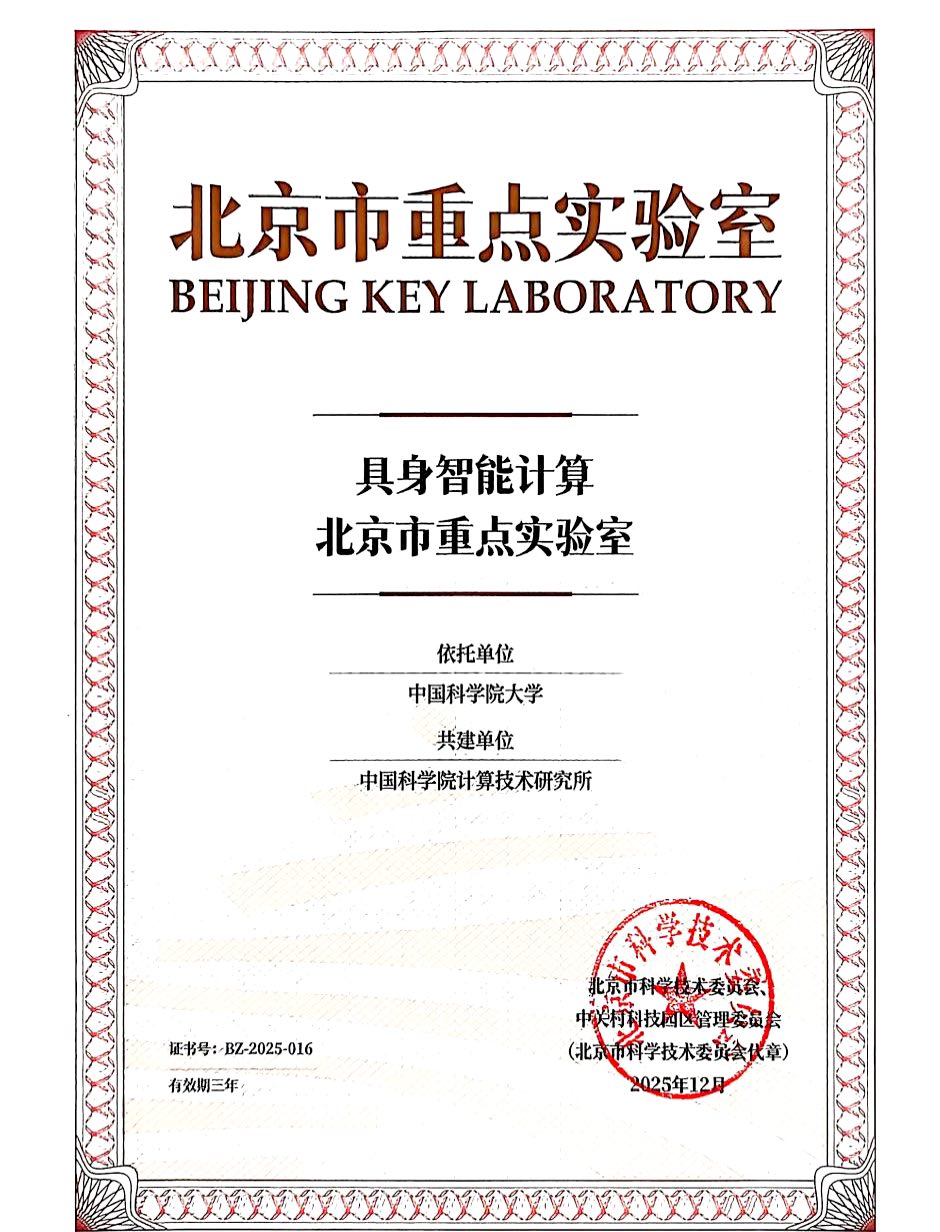 近日,北京市科学技术委员会、中关村科技园区管理委员会公布了北京市重点实验室认定名单。具身智能计算北京市重点实验室正式获批,实验室依托中国科学院大学,联合中国科学院计算技术研究所共同建设。